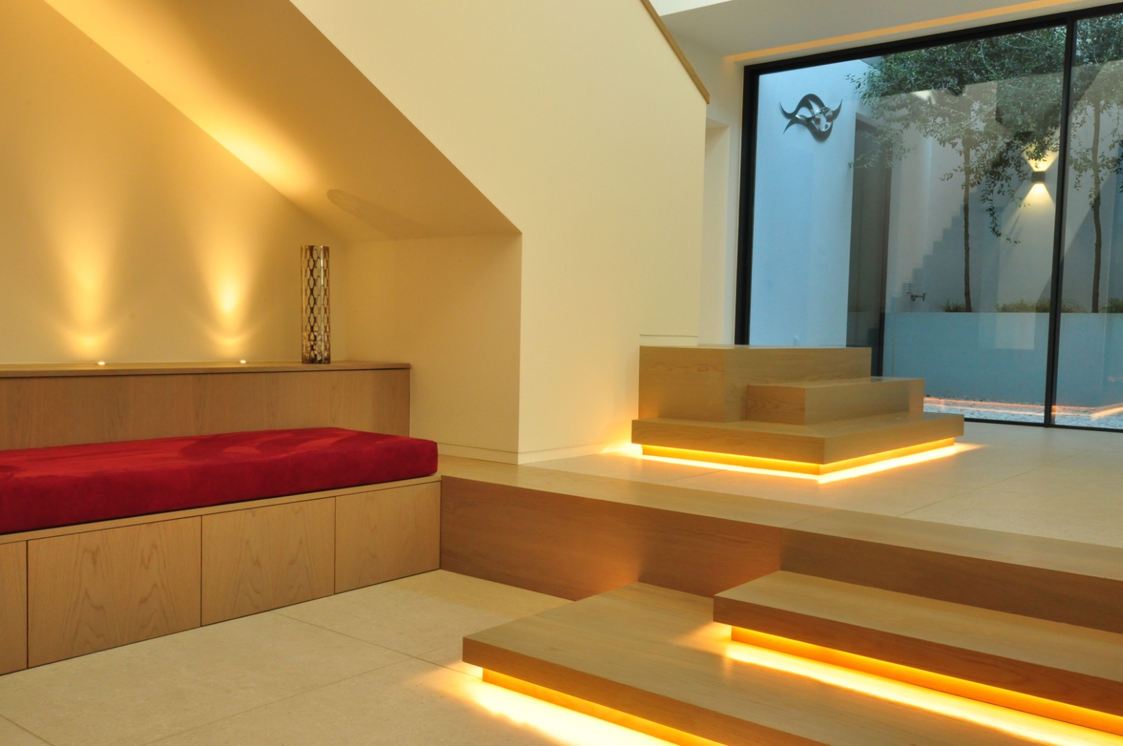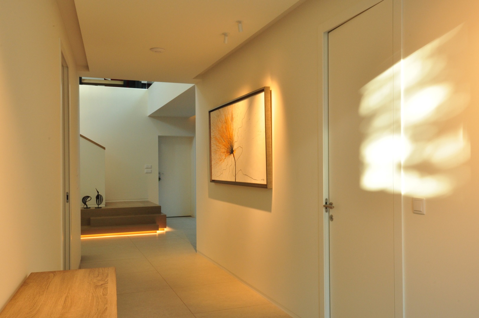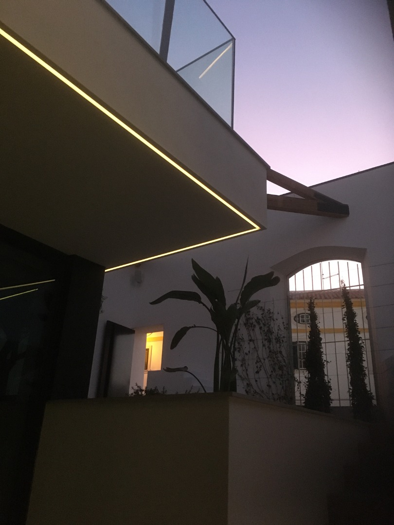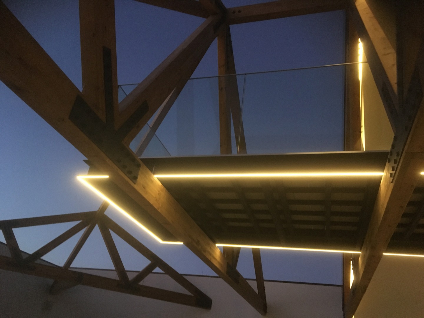 The lighting in this project highlights de modern architecture through the use of sleek indirect lines. These create a floating effect on te structure and emphasize the wooden beams and glass features. Inside, warm lighting provides a cozyy atmosphere, while outside the illumination enhances the architectural details and reinforces de transition between old and new.